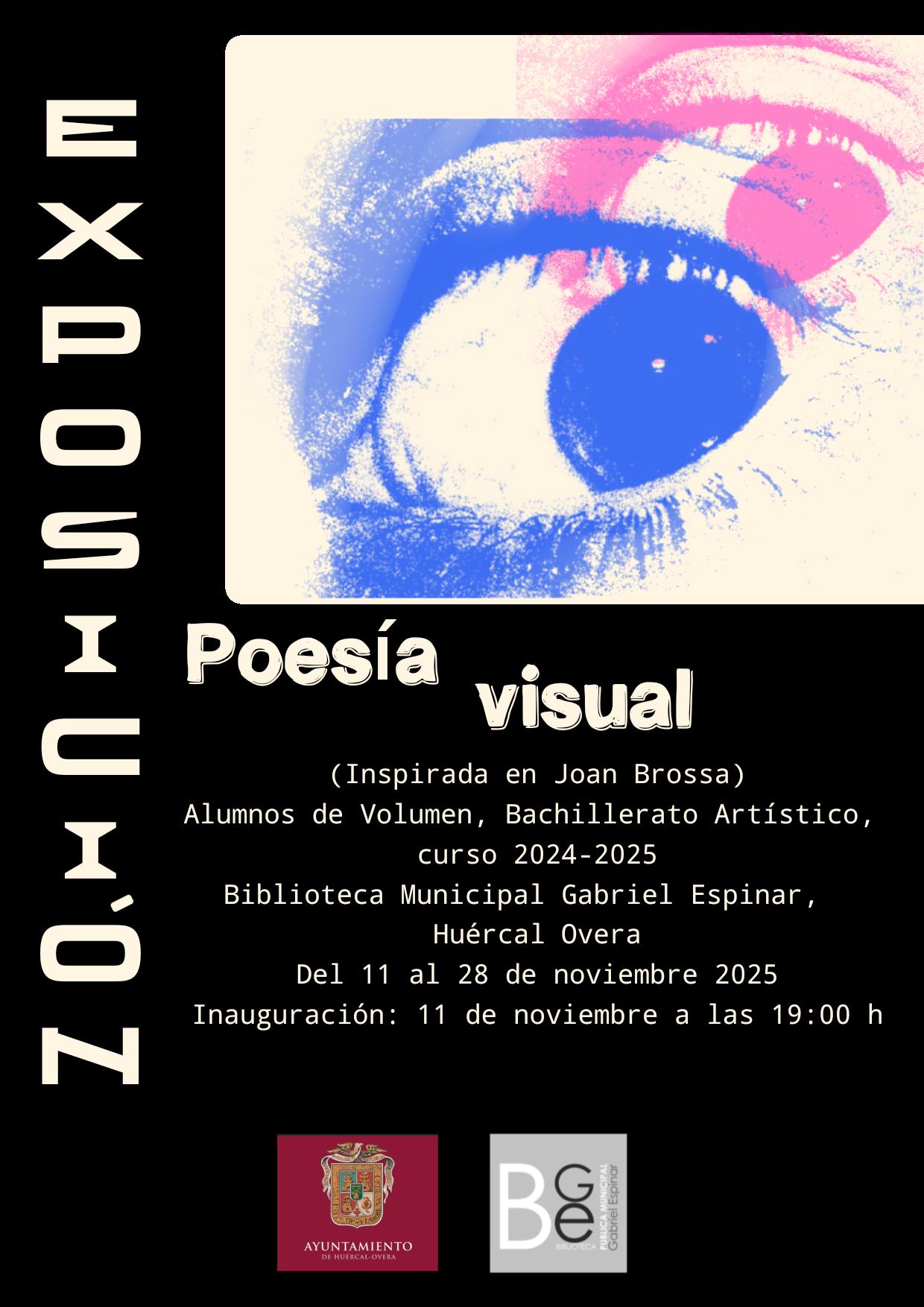 La Biblioteca Pública Municipal “Gabriel Espinar” de Huércal-Overa acoge desde el 11 hasta el 28 de noviembre la exposición “Poesía Visual”, una muestra inspirada en la obra del artista catalán Joan Brossa realizada por los alumnos de 2º Bachillerato Artístico del I.E.S.Cura Valera en el curso 2024/25.