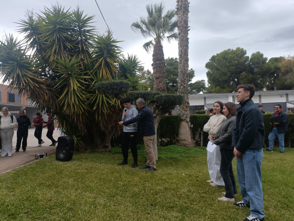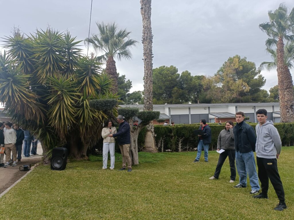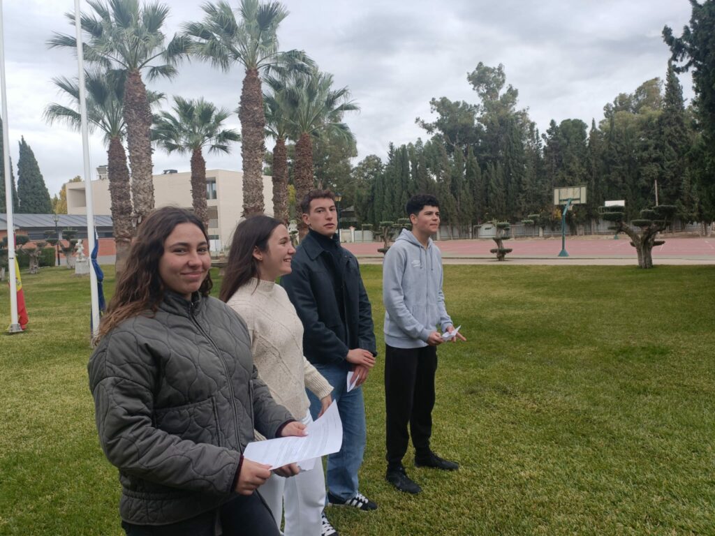 A continuación, el propio alumno y, el alumno Miguel Ángel García Castelllano leyeron los artículos 14, sobre la Igualdad de los españoles y 43 que, reconoce el derecho a la protección de la salud y la obligación de los poderes públicos de organizar y tutelar la salud pública, a través de medidas preventivas y servicios, contenidos en la Constitución. Las alumnas Begoña y Sorina izaron las banderas de España y de la Unión Europea.