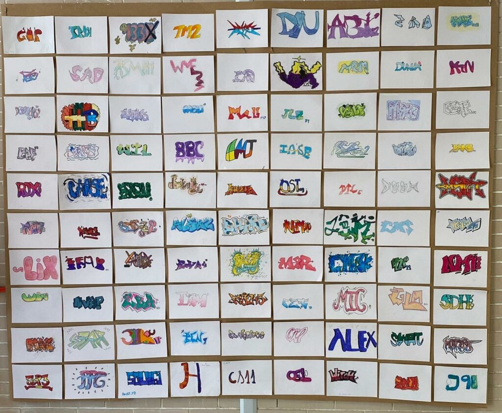 A lo largo del proceso creativo, el alumnado ha explorado el círculo cromático, la aplicación de colores fríos y cálidos, así como el diseño, encaje y composición de graffitis propios y originales, fomentando la creatividad, la expresión personal y el pensamiento artístico.
