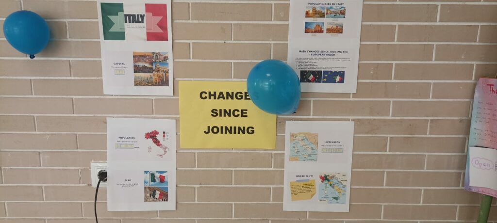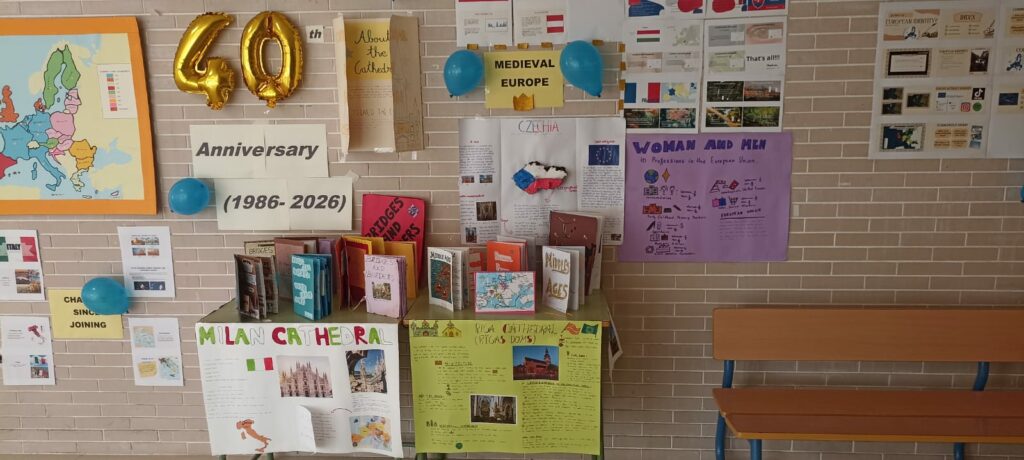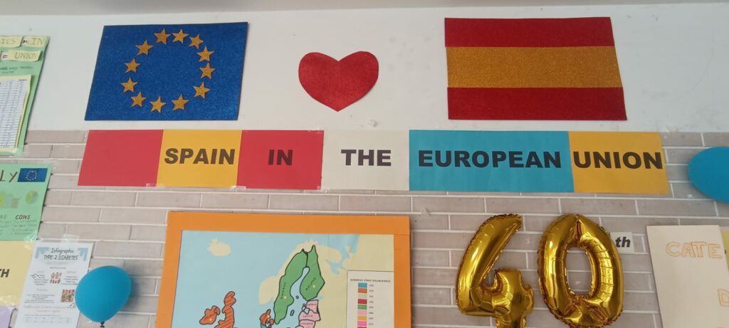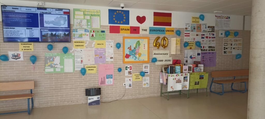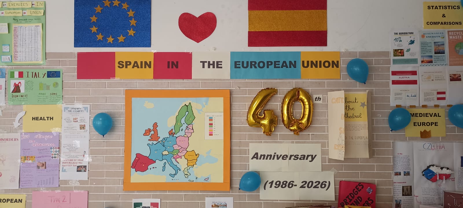 El IES Cura Valera ha conmemorado el 40 aniversario de la entrada de España en la Unión Europea con una exposición ubicada en su hall. Este ha sido el resultado final del trabajo del alumnado de 1º a 4º de la ESO, junto a 1º de Bachillerato, en un proyecto integrado realizado desde las diferentes materias bilingües, con la Unión Europea como eje temático.